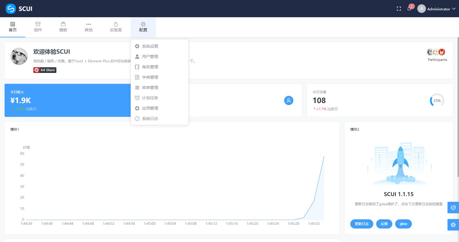 SCUI提供4套布局方案,分别是默认的分栏布局和头部导航布局,均可在配置中设置。